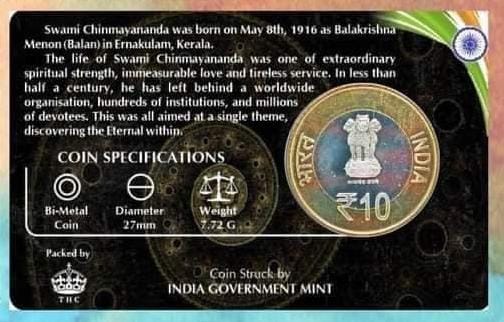 10 Rs SWAMI CHINMAYANANDA rare Commemorative Coin Card Special Edition