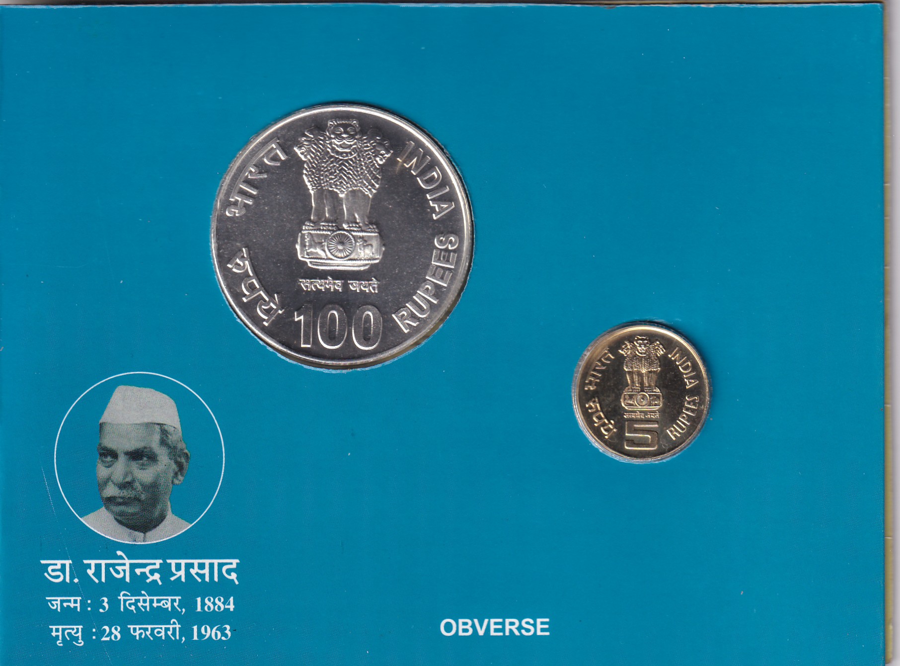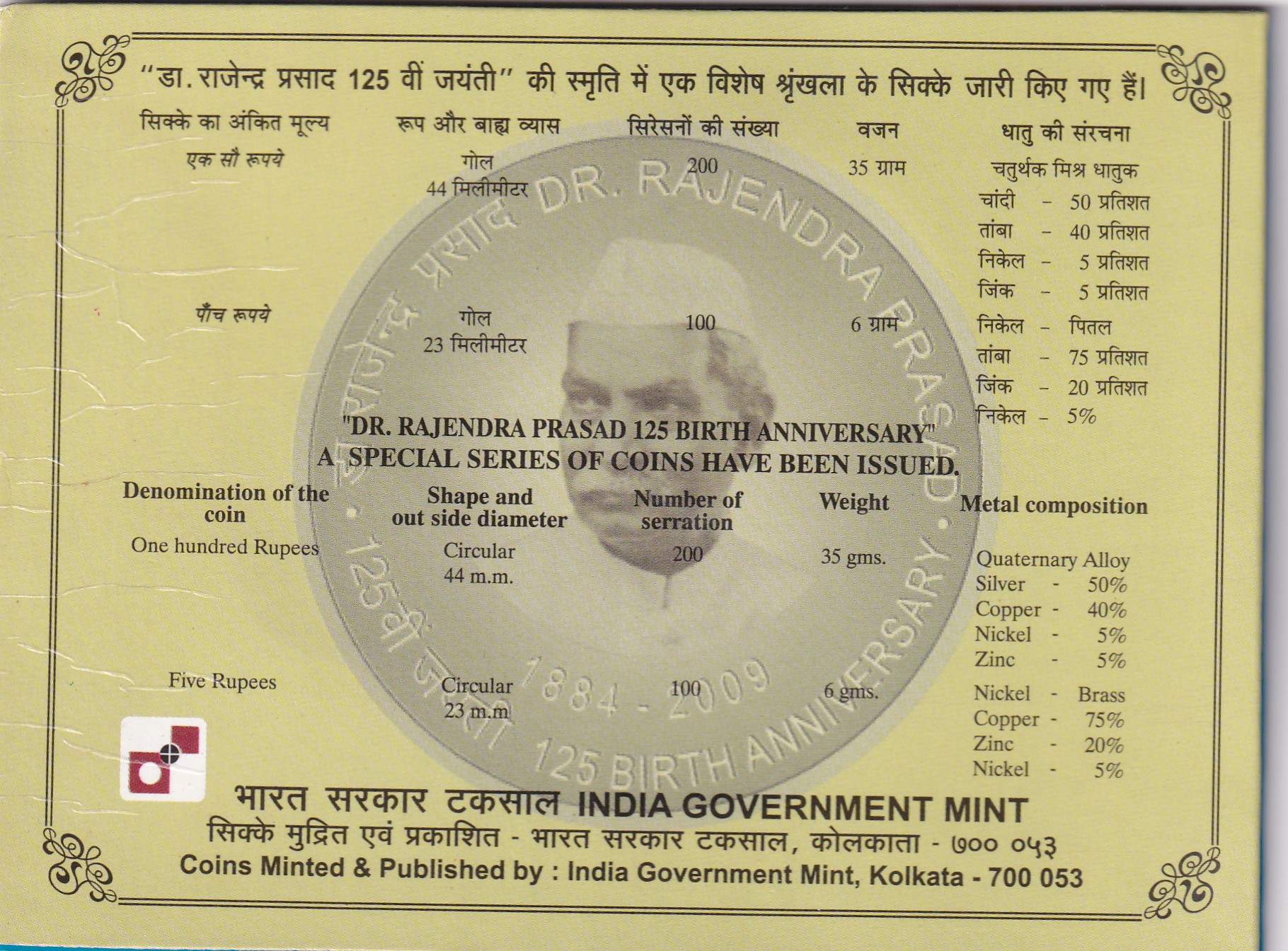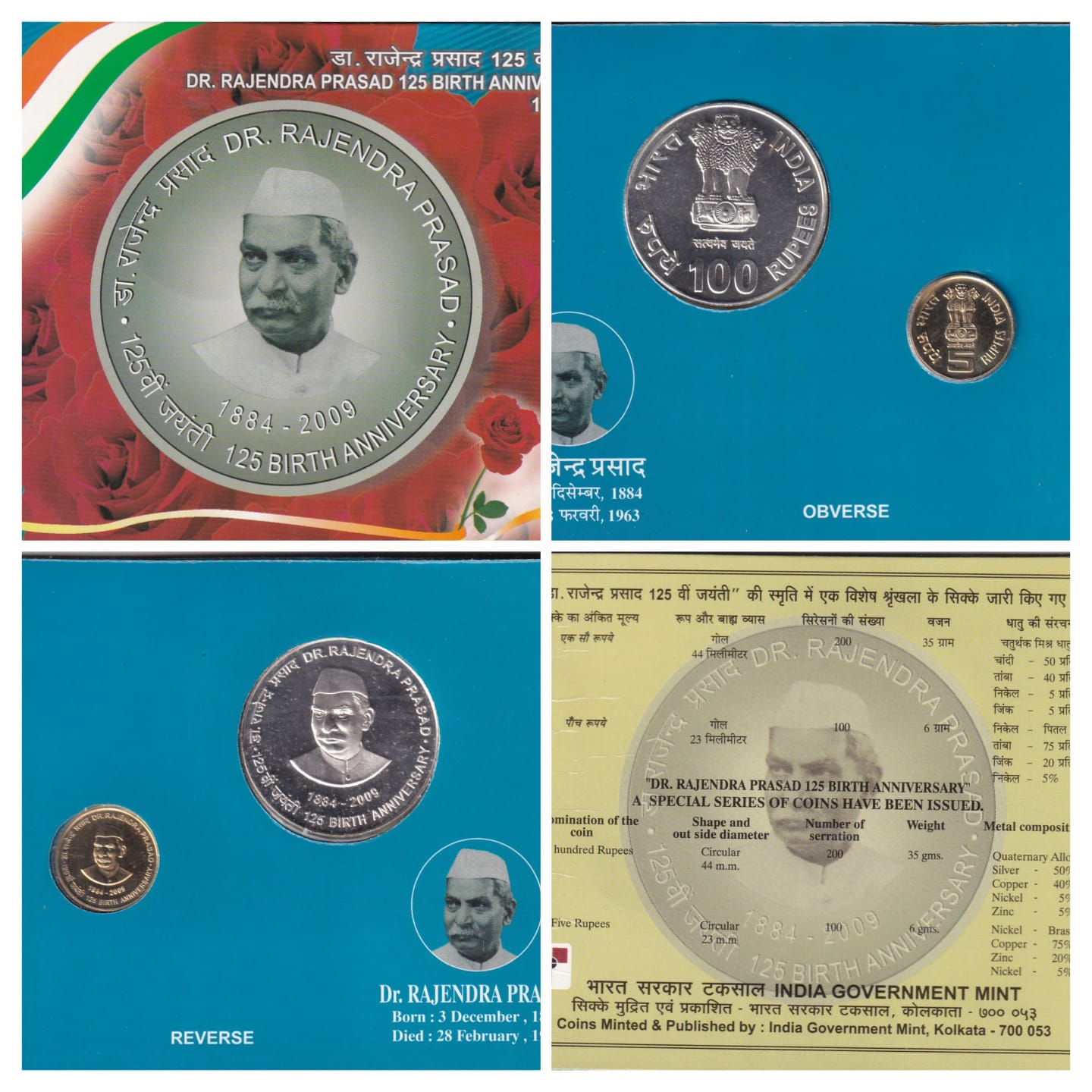 125 Birth Anniversary DR. Rajendra Prasad (1884-2009) Kolkata Mint 2 Coin UNC Set