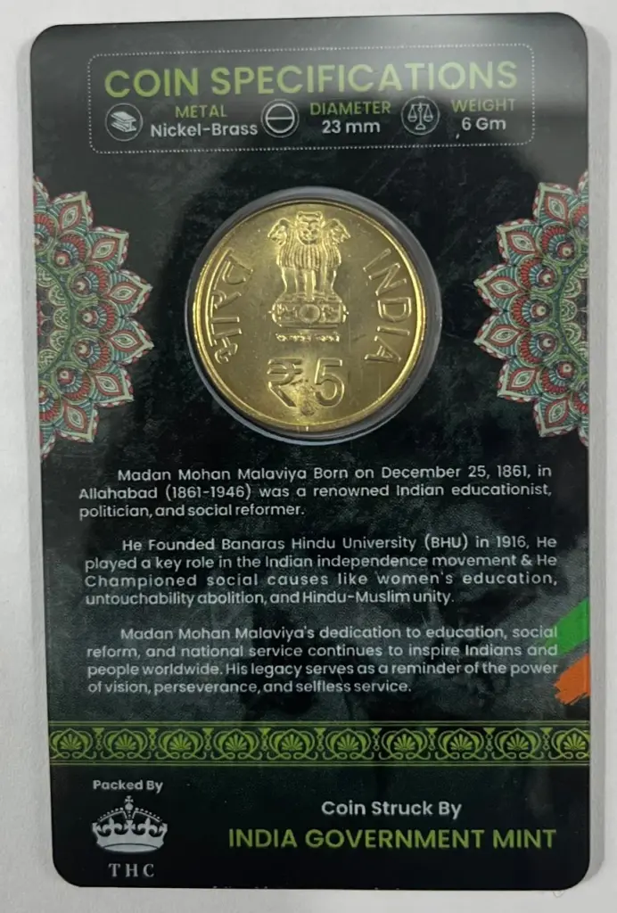 5 Rs. 150TH BIRTH ANNIVERSARY OF MADAN MOHAN MALAVIYA rare Commemorative Coin Card Special Edition
