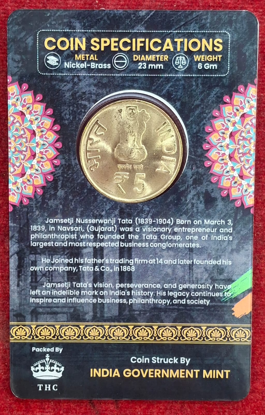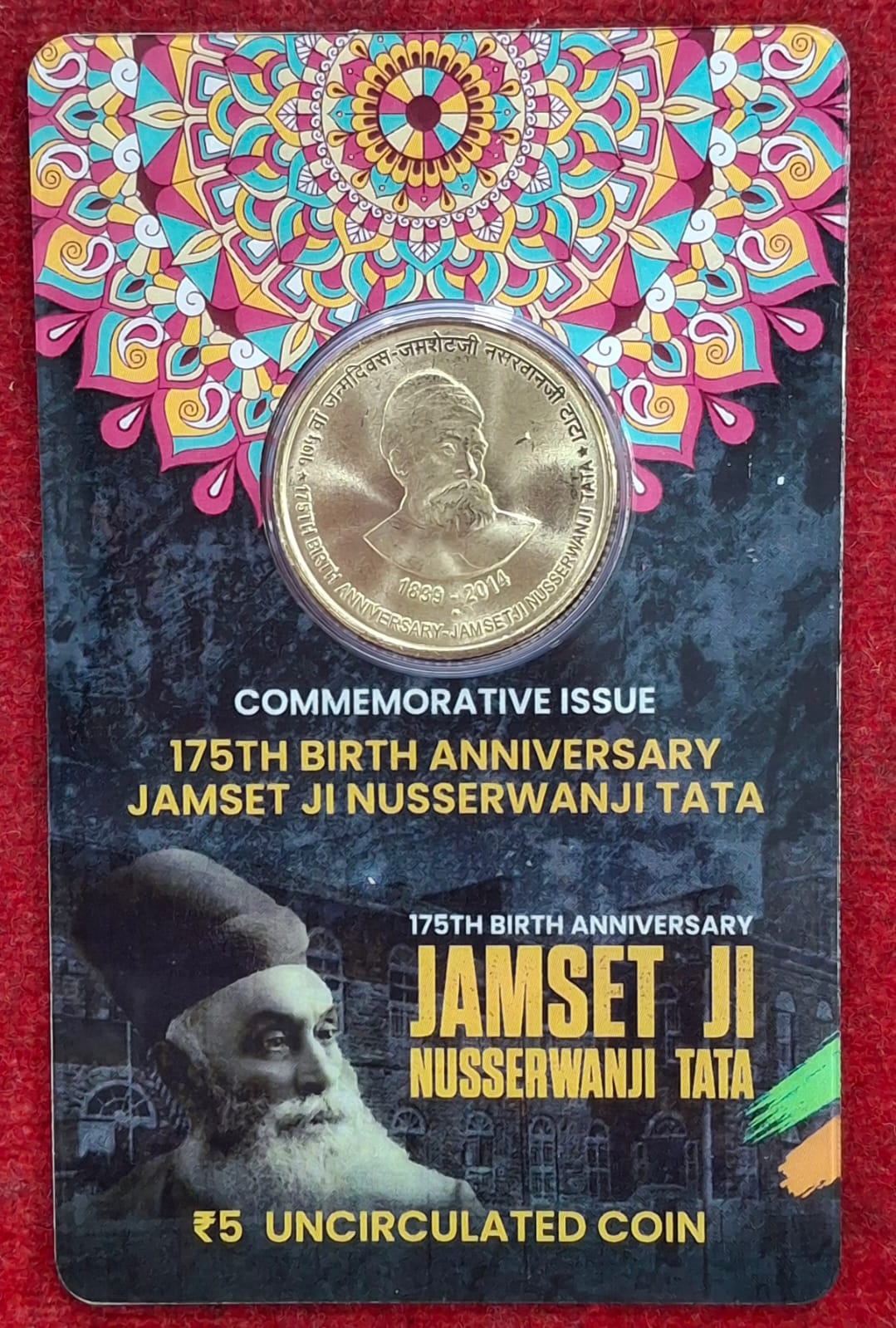 5 Rs. JAMSET JI TATA rare Commemorative Coin Card Special Edit