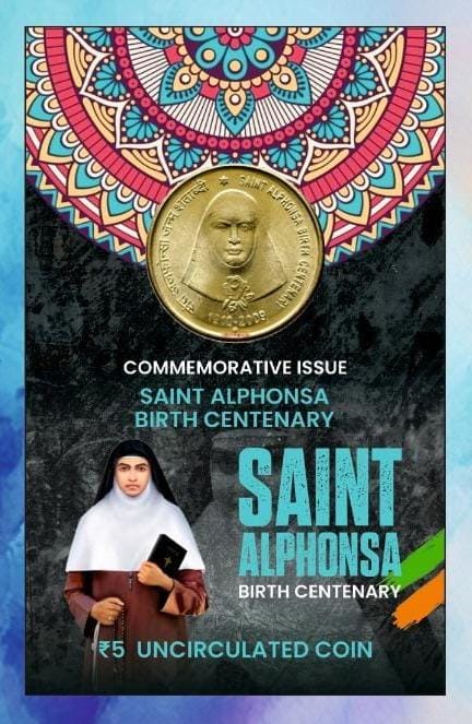 5 Rs. Saint Alphonsa Birth centenary rare Commemorative Coin Card Special Edition
