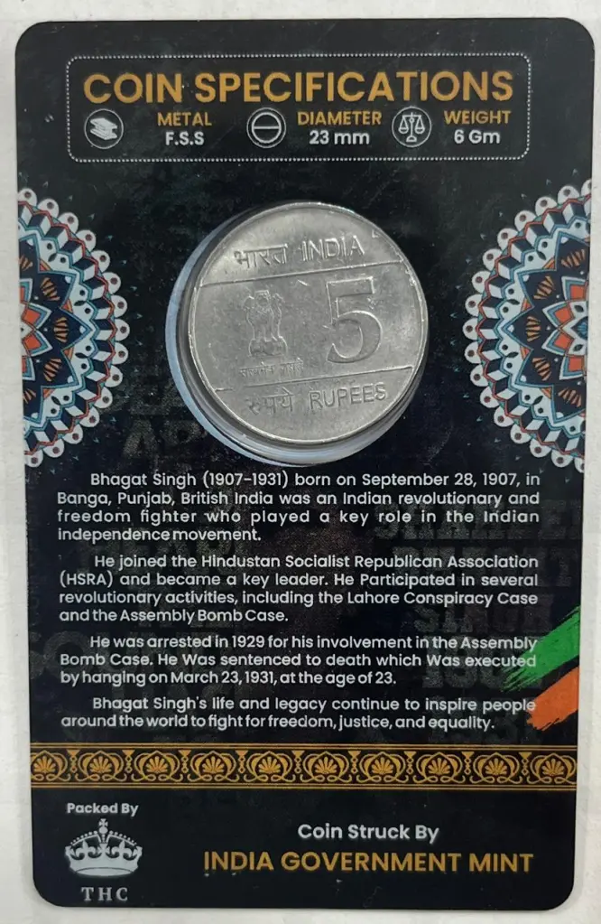 5 Rs SHAHEED BHAGAT SINGH BIRTH CENTENARY COMMEMORATIVE ISSUE RARE COIN CARD SPECIAL EDITION