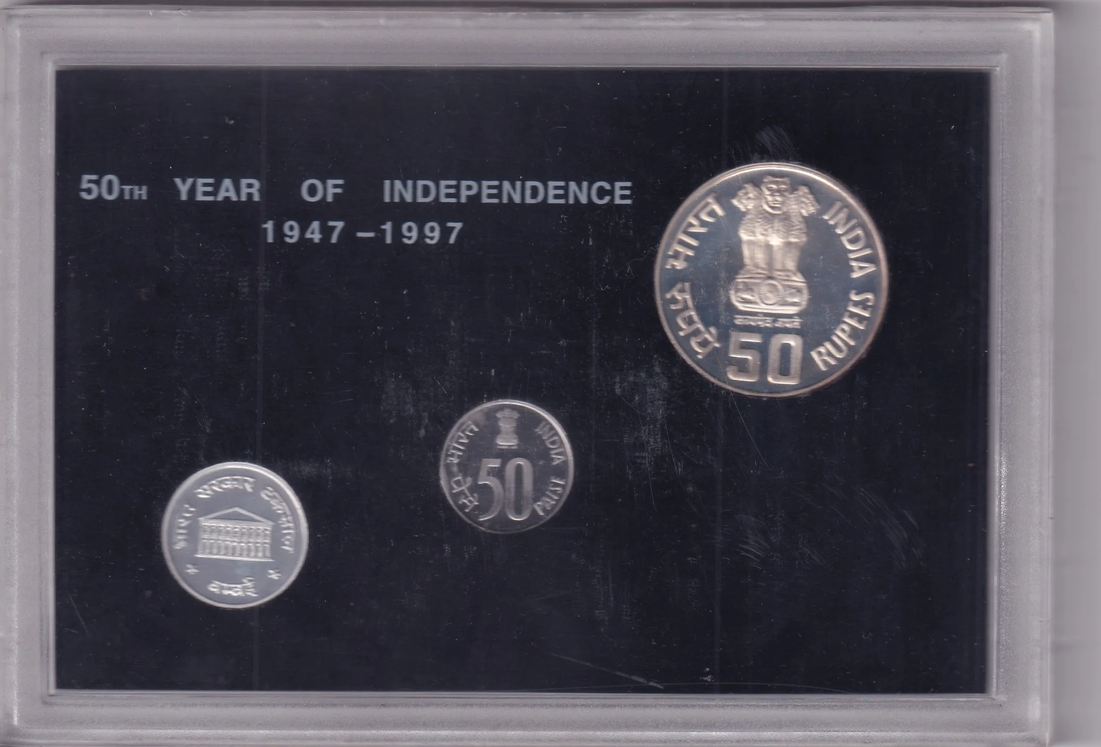 50th YEAR OF INDEPENDENCE 1947-1997 INDIA GOVT. MINT BOMBAY COMMEMORATIVE VIP 3 COINS PROOF SET RARE