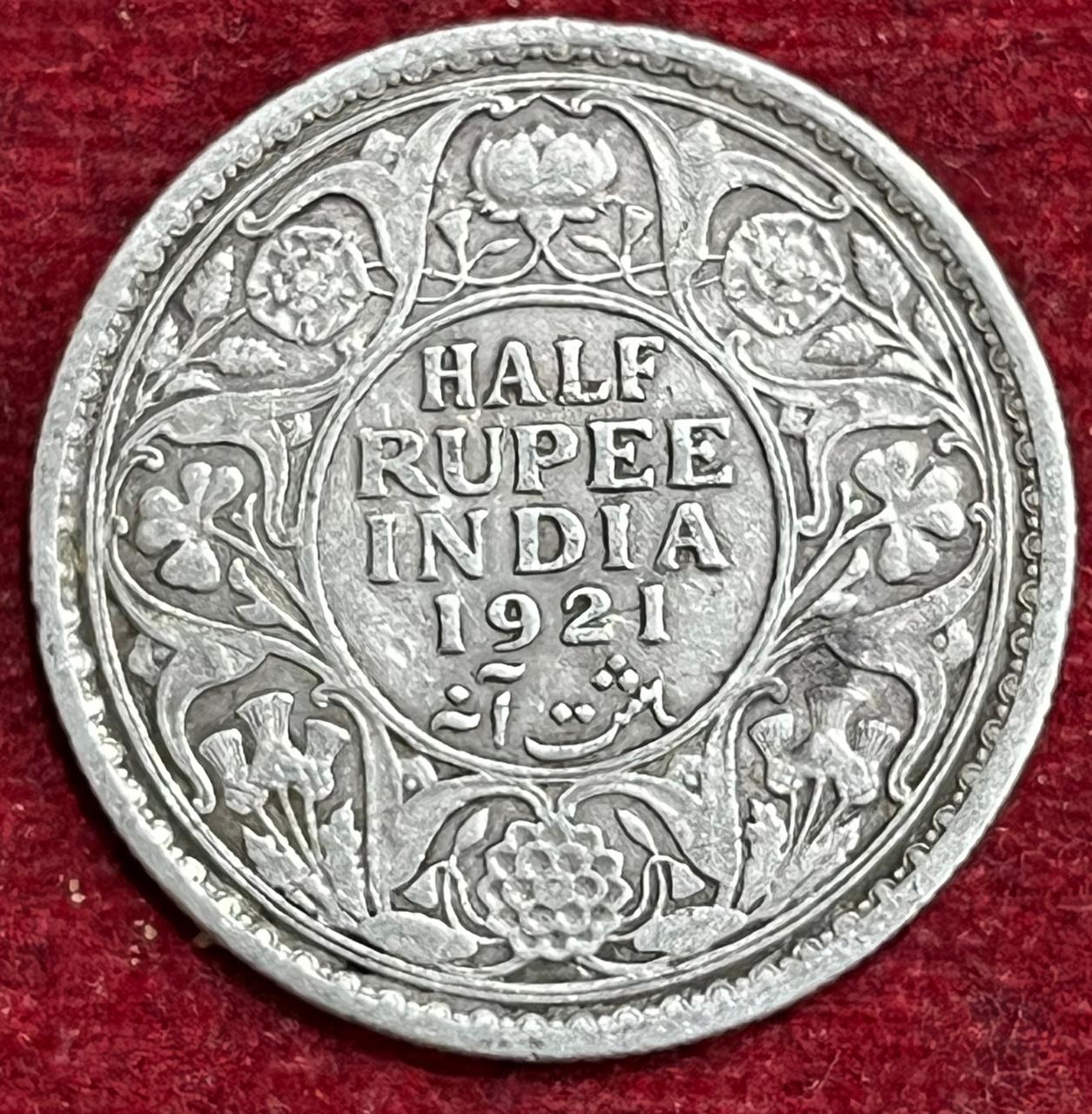 BRITISH INDIA 1/2 RUPEES -GEORGE V 1921 RARE SILVER COIN #V-322