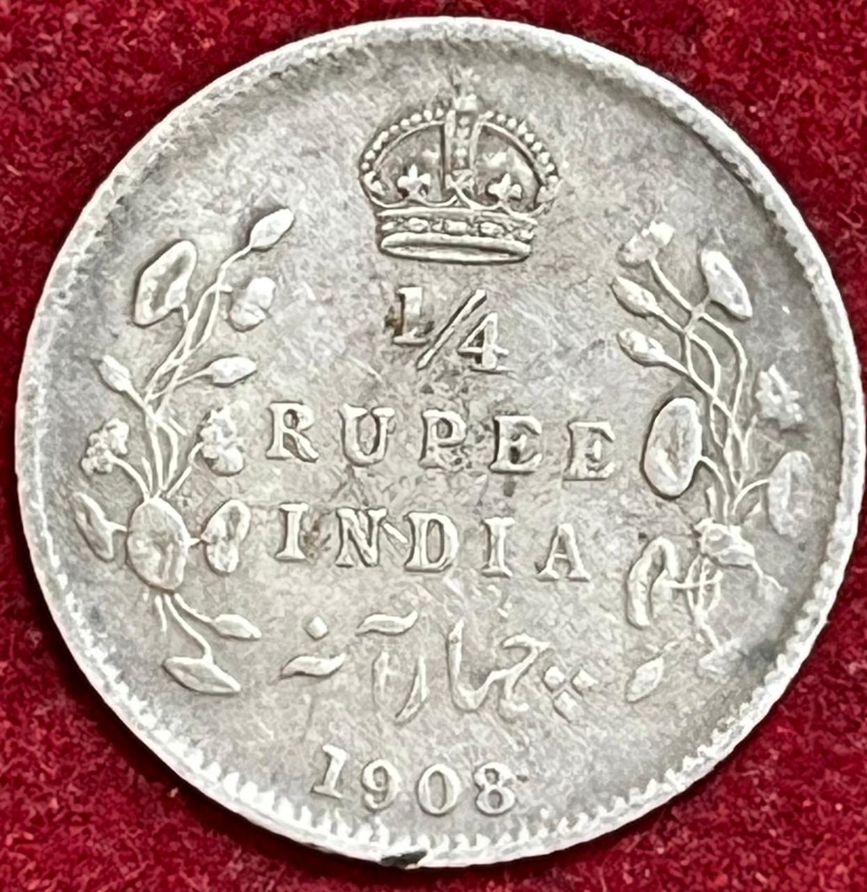 BRITISH INDIA 1/4 RUPEES 1908 RARE SILVER COIN #V-365