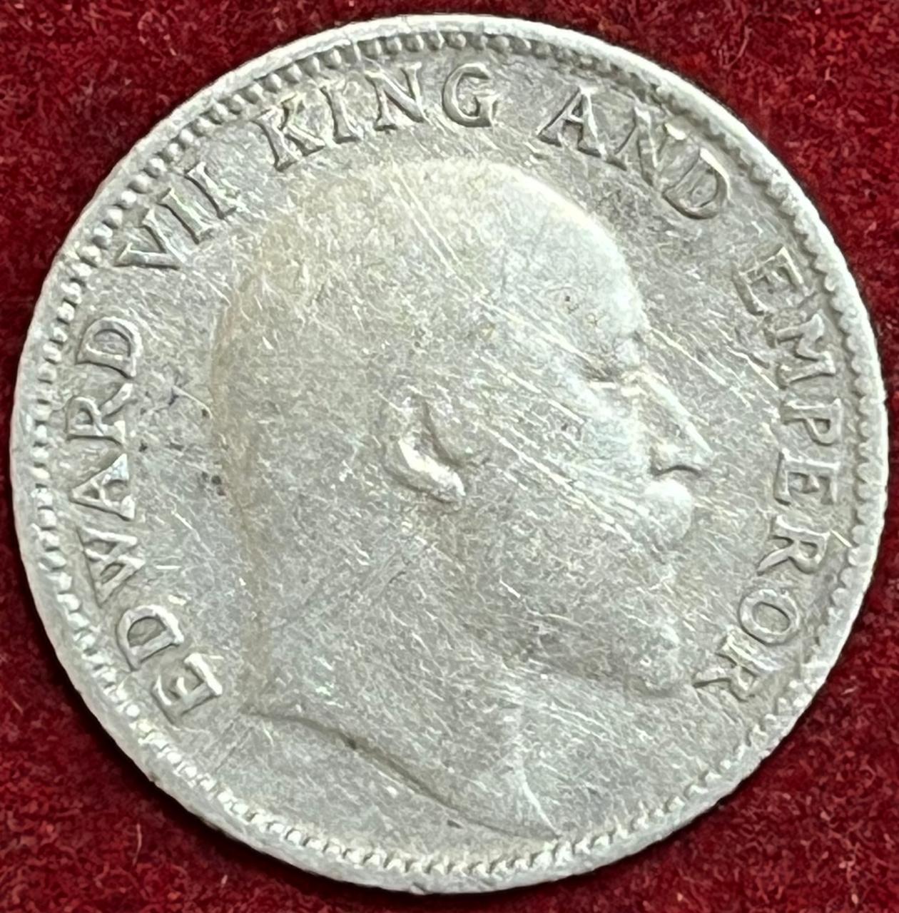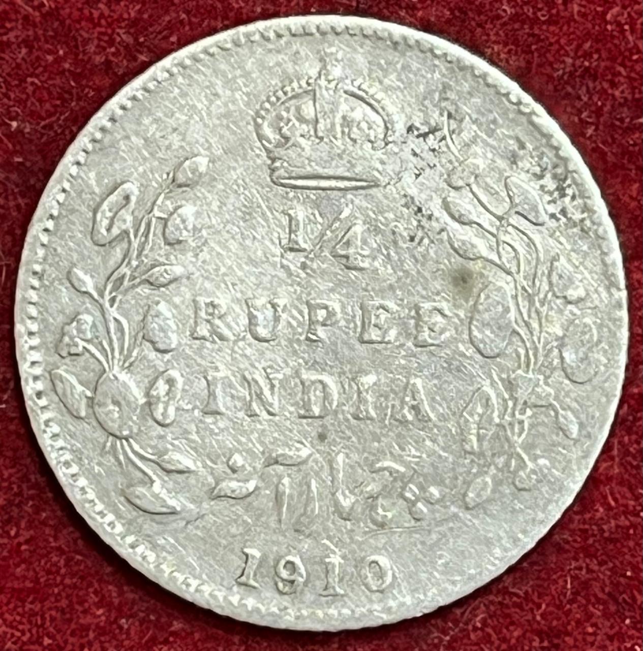 BRITISH INDIA 1/4 RUPEES 1910 RARE SILVER COIN #V-360
