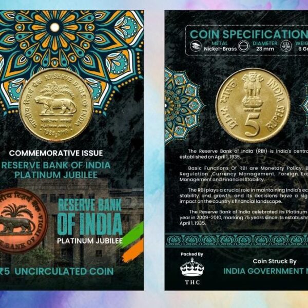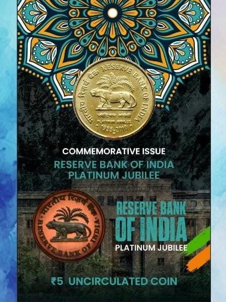5 Rs. Reserve Bank Of India Platinum Jubilee Rare Commemorative Coin Card Special Edition