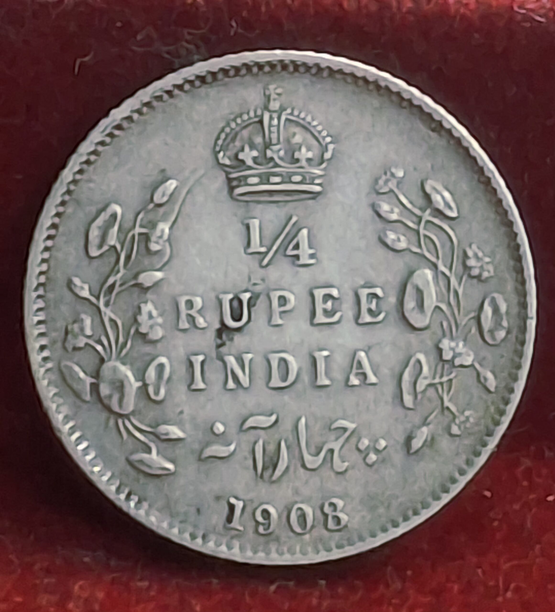 • Reverse: Denomination “¼ Rupee” and the year “1908” within a decorative floral wreath, accompanied by inscriptions in English and Persian.