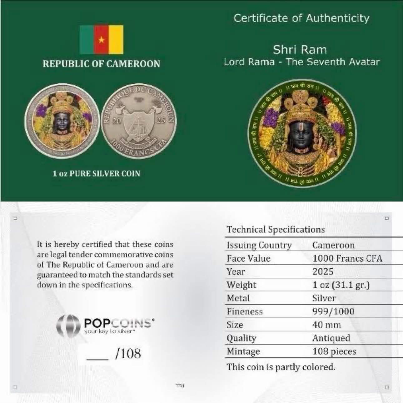 Lord Ram – Vishnu’s 7th Incarnation (Hindu Gods series) 2025 Cameroon 🇨🇲 1000 Francs CFA 1 oz 999 silver / Antique Finish Individual Serialised – Maximum Mintage 108 With Box & COA Price in Pm